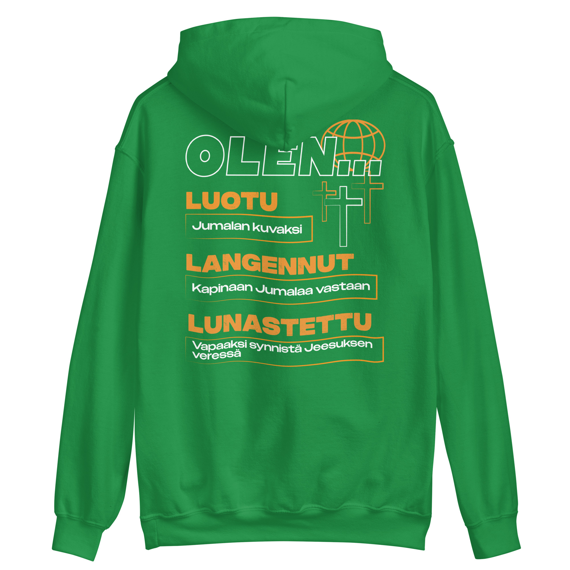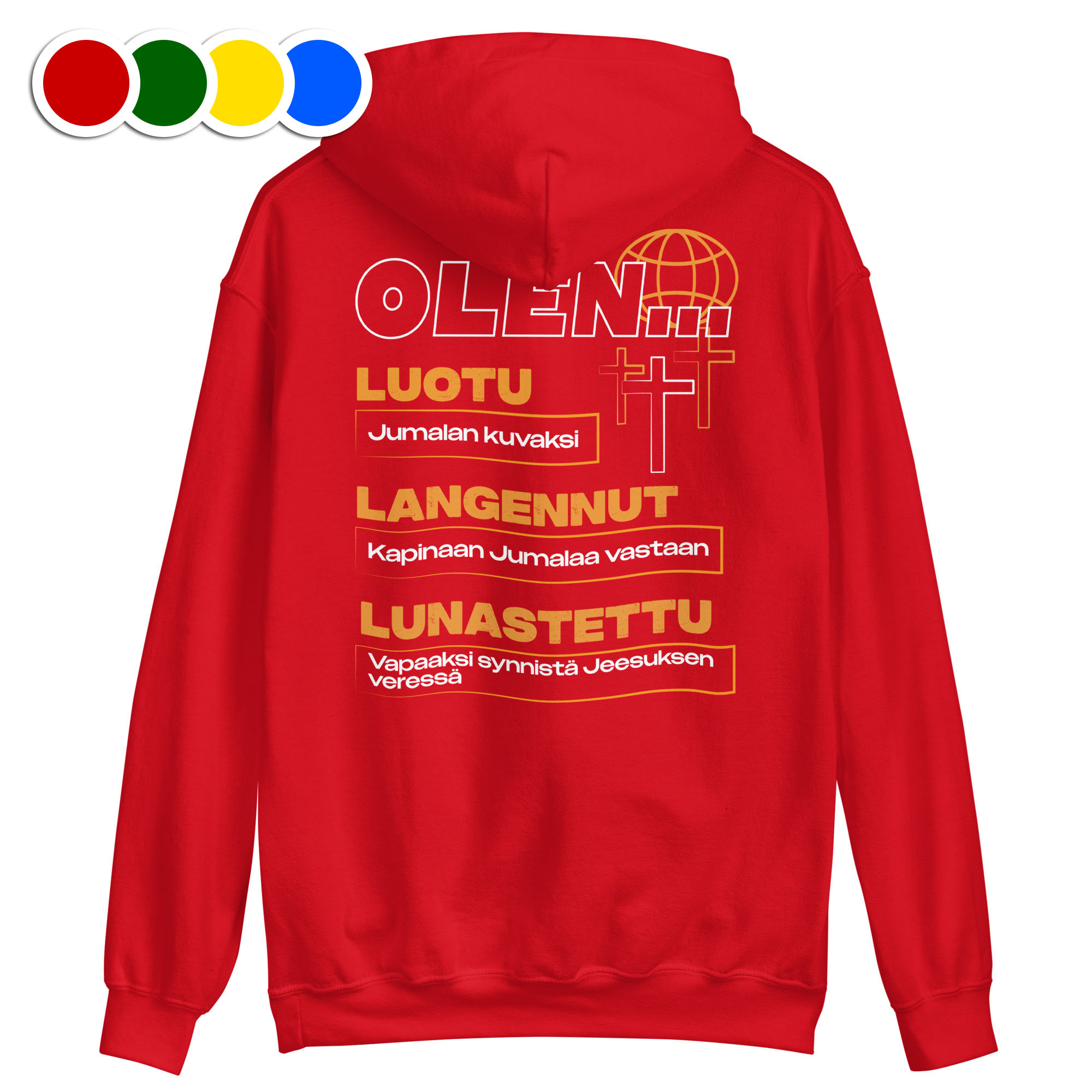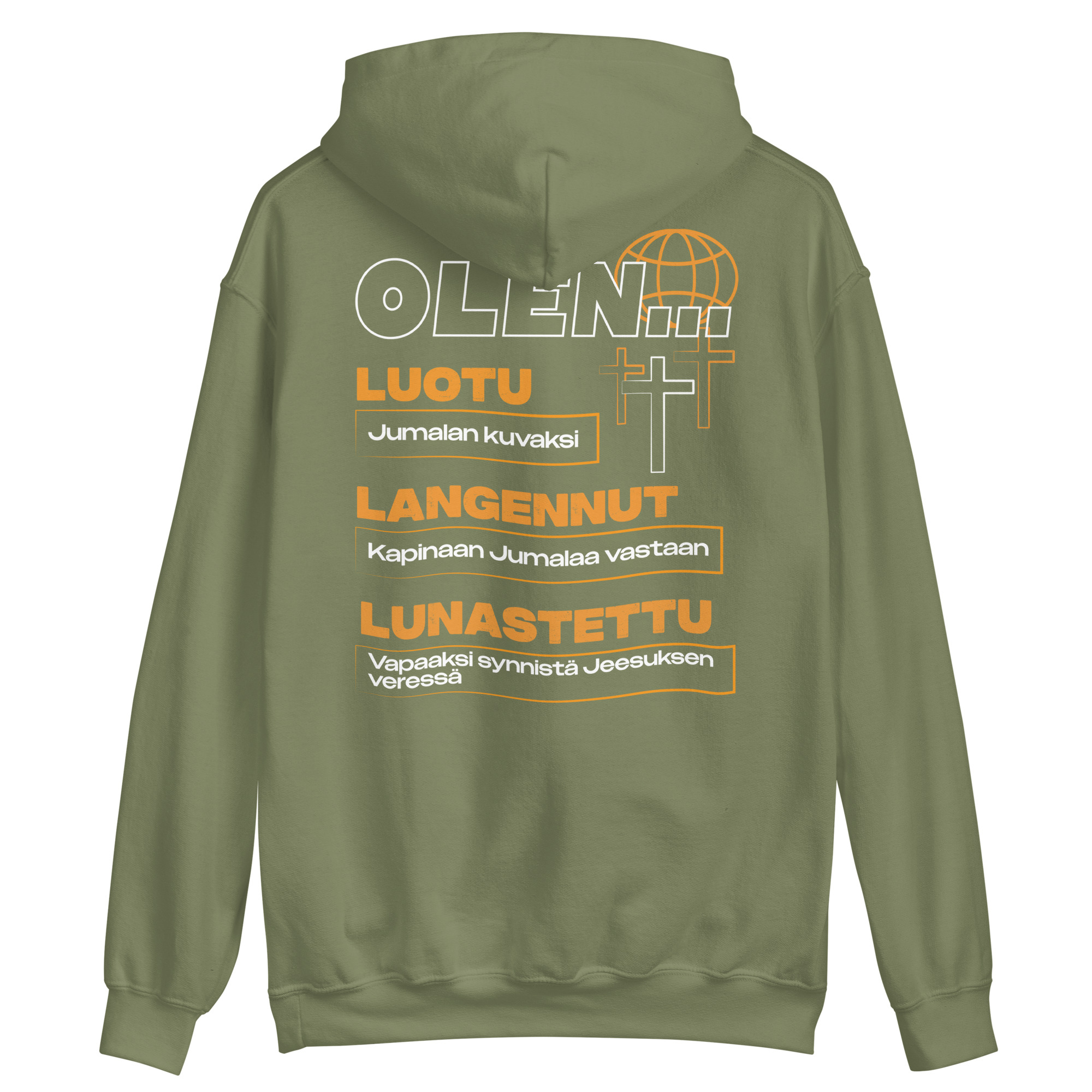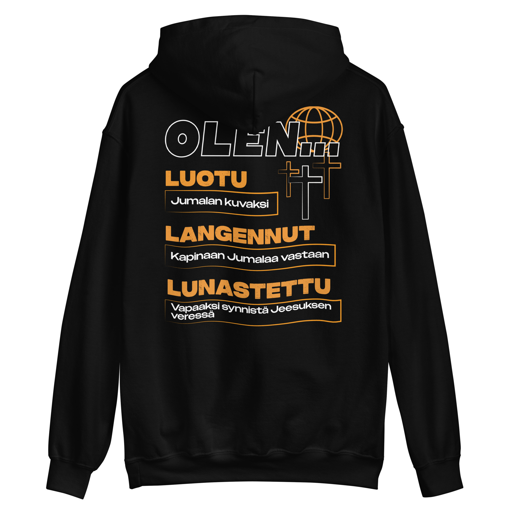 ”Olen Luotu, Langennut ja Lunastettu”-grafiikalla varustettu huppari.