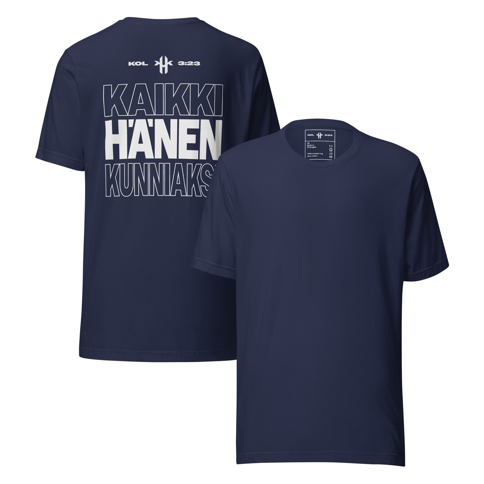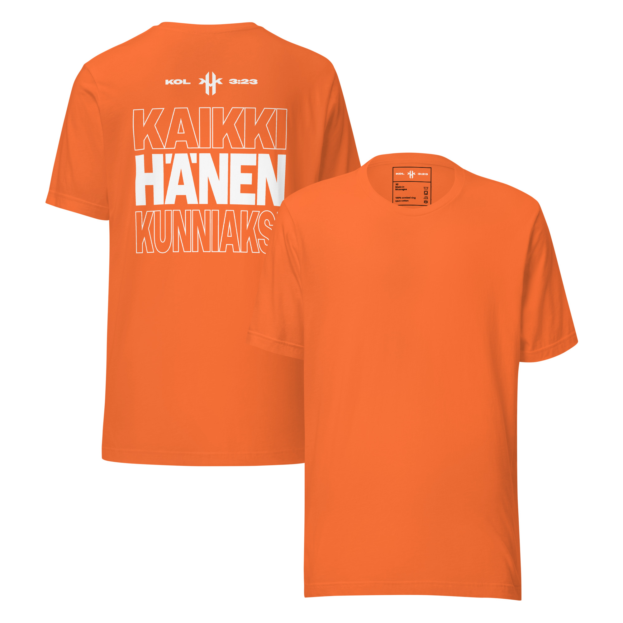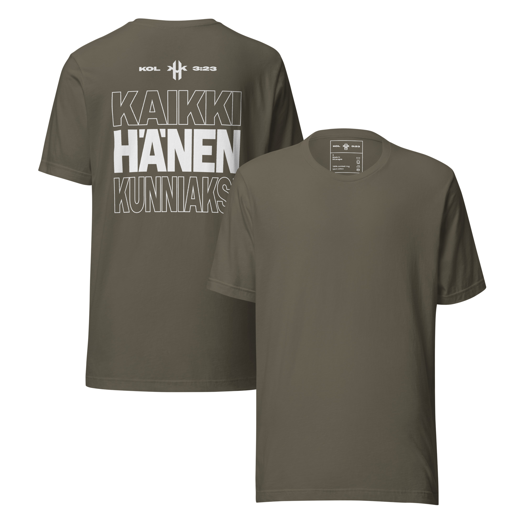 Tämä unisex t-paita sopii kaikille! Paidan kangas on mukava ja pehmeä päällä, koska siinä on sopiva määrä venyvyttä. Paidan etupuoli on tyhjä ja selästä löytyy suuri ”Kaikki Hänen Kunniaksi” -grafiikka.